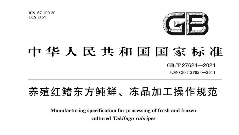 國家標準GB/T27624-2024《養殖紅鰭東方鲀鮮、凍品加工操作規范》正式發布
